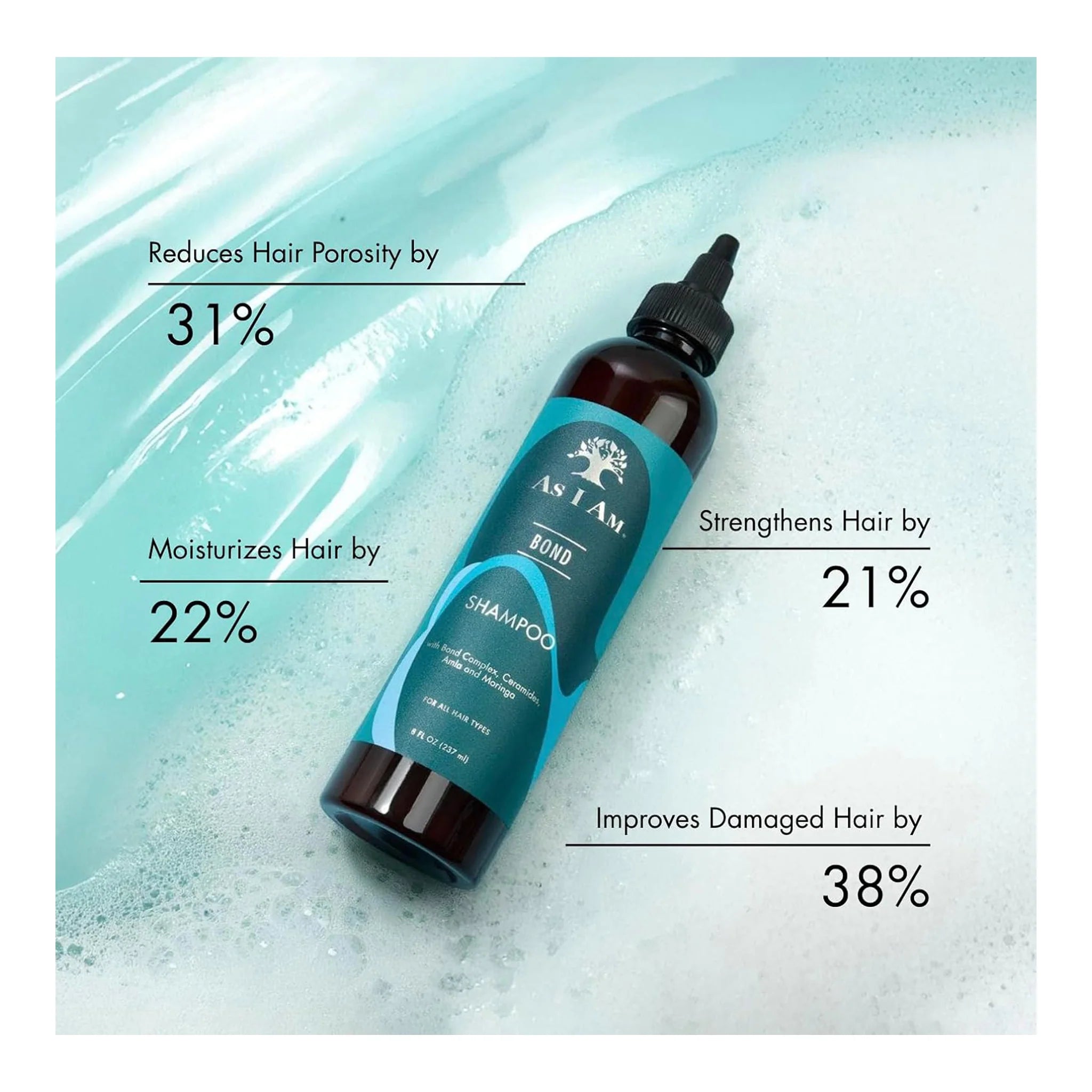 AS I AM Bond Shampoo gently cleanses while helping reinforce the hair’s internal bonds for improved strength and resilience. Its moisture-balanced formula removes buildup without stripping, leaving curls, coils, and waves soft, hydrated, and ready for conditioning. Ideal for damaged, dry, or chemically treated hair.