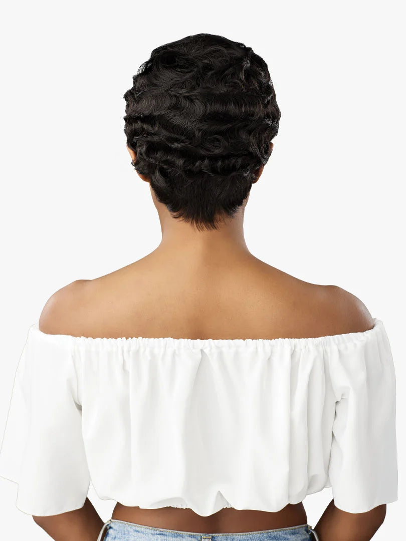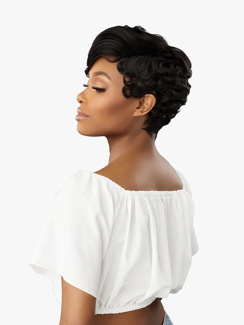 Curly pixie cut with full top volume and tapered Finger waves on the side.