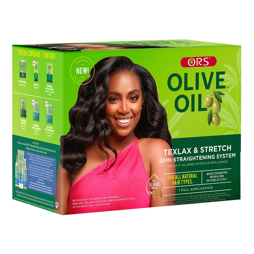 Curly or straight, textured or smooth, ORS™ Olive Oil Texlax & Stretch Semi-Straightening System helps increase the manageability of coils and curls without sacrificing hair health and body. Olive Oil Relax & Stretch semi-straightens natural curl patterns up to 50%—leaving your hair with just the right amount of thickness for styling versatility.