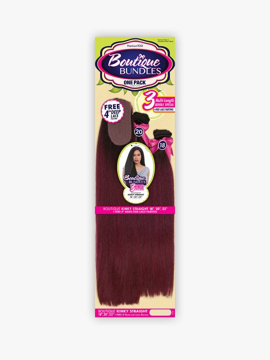 Sensationnel Human Hair Blend Weave Premium Too 3 Multi Bundles Boutique Kinky Straight (18"+20"+22") + 4" Deep Lace Parting; Premium Too Human Hair; Premium Fiber Blend; Includes 3pcs Multi-length + FREE 4" Deep Lace Parting closure; Sensationnel Style at a Sensationnel Value